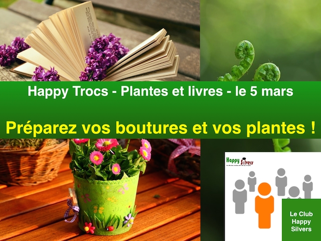 Happy Silvers organise un troc de plantes et de livres réservé aux membres de son club. Il aura lieu le 5 mars à Trinité au Domaine Habitation Merveilleuse : jardiniers en herbe ou amateurs avertis, voilà un beau moyen de trouver la « Plante » que vous cherchez depuis des années et qui poussait dans le jardin de votre grand-mère ! Ne résistez plus et venez participer à Happy Trocs. L’inscription au Club peut se faire directement en ligne sur le site d’Happy Silvers. Pour bien vous y préparez, commencez à faire le tri et à préparer vos plantes, vos graines ou vos boutures. Mettez de côté des pots de yaourts qui vous permettront de faire pousser vos boutures ou encore mettez à tremper vos pousses dans de l’eau au préalable afin d’obtenir des racines.